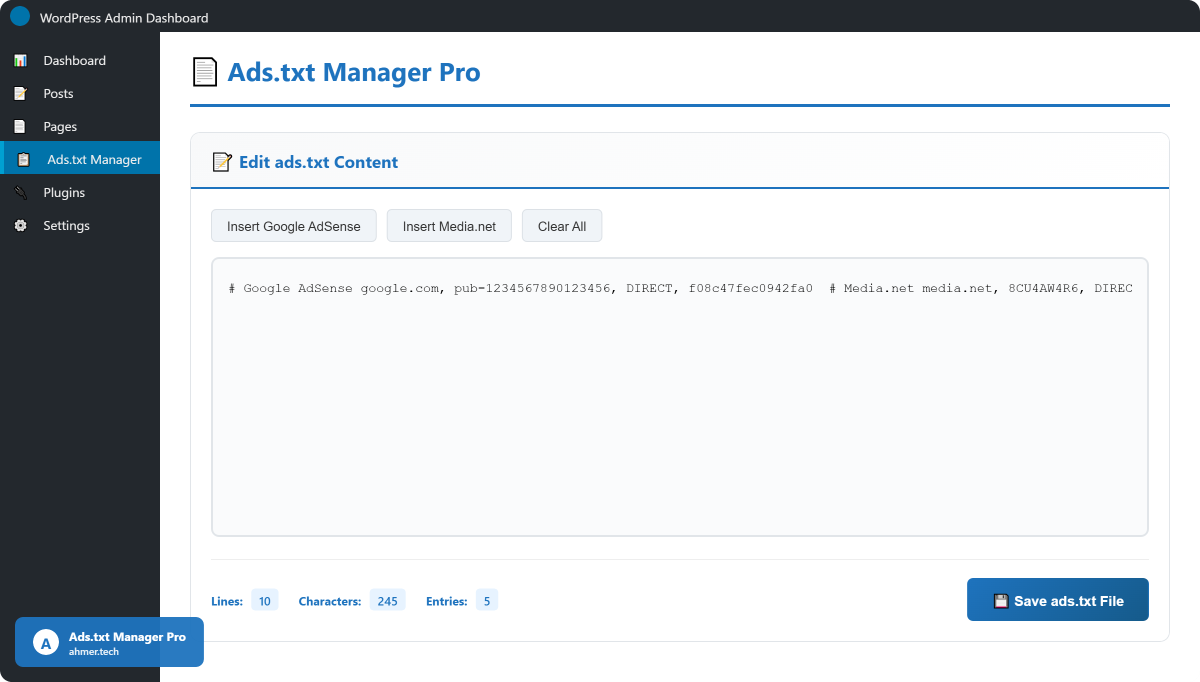 Ads.txt Manager Pro is a powerful WordPress plugin that allows you to create, edit, and manage your ads.txt file directly from WordPress admin without using FTP or file managers.