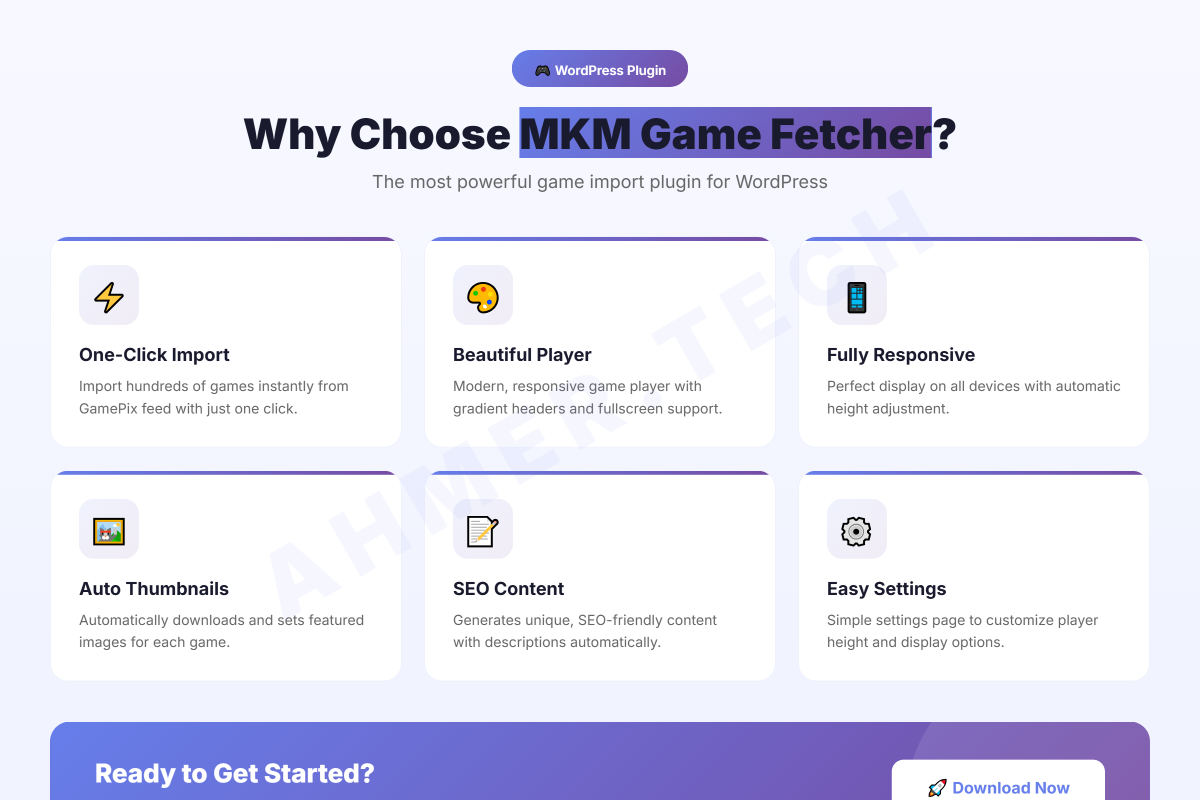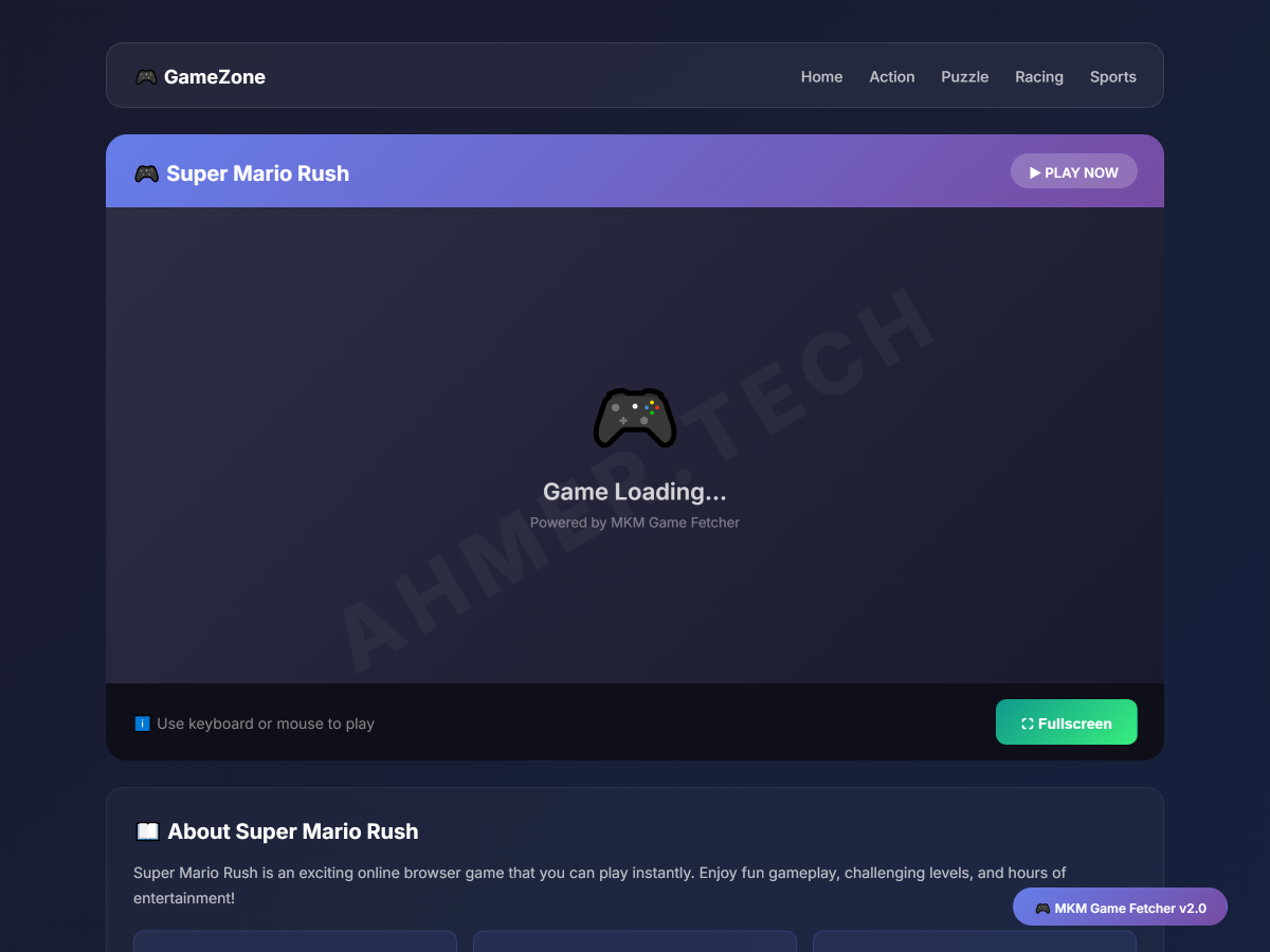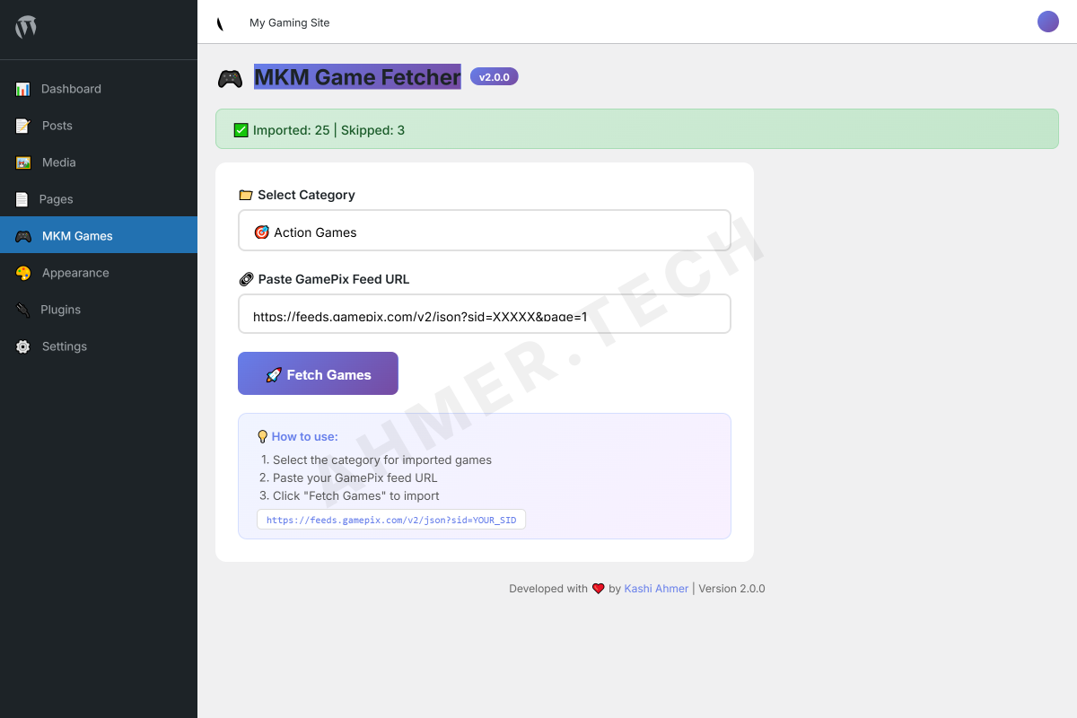 MKM Game Fetcher is a WordPress plugin that allows website owners to import HTML5 browser games from GamePix feed directly into their WordPress site. Each game is imported as a WordPress post with automatically generated content, featured image, and an embedded game player.